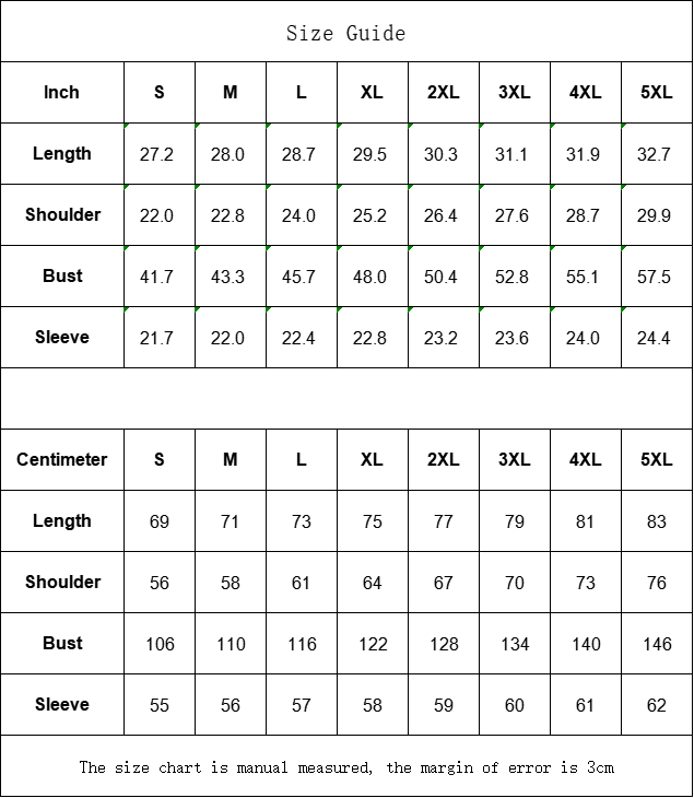 Centimeter | S | M | L | XL | 2XL | 3XL | 4XL | 5XL |