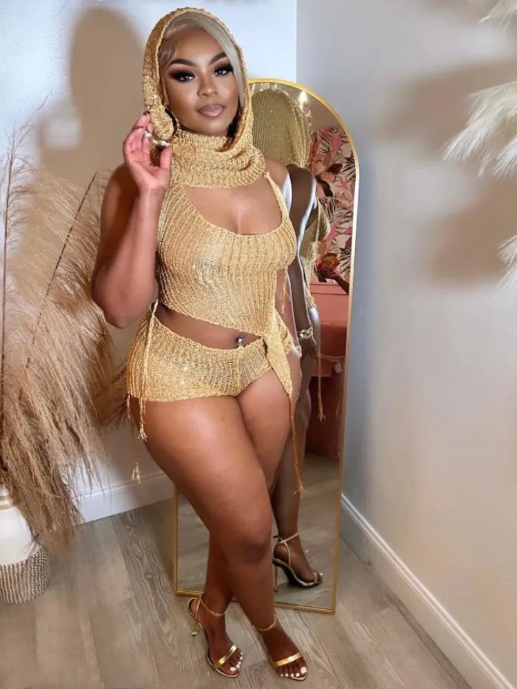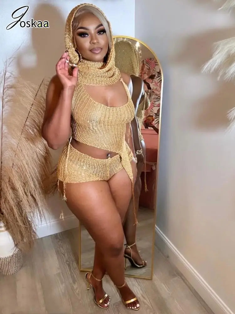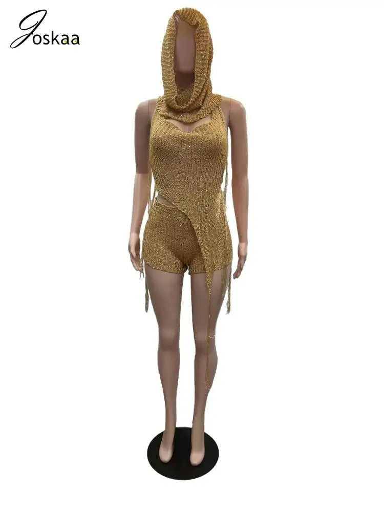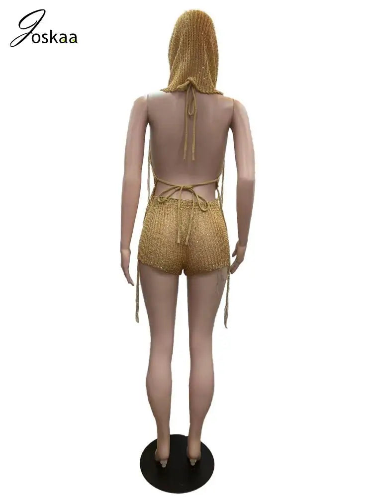 Joskaa Sequins Knit Beach 3 Piece Sets Women Sexy Backless Halter Irregular Top+Head Scarf+Shorts Matching Set Vacation Outfits