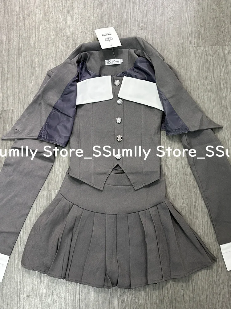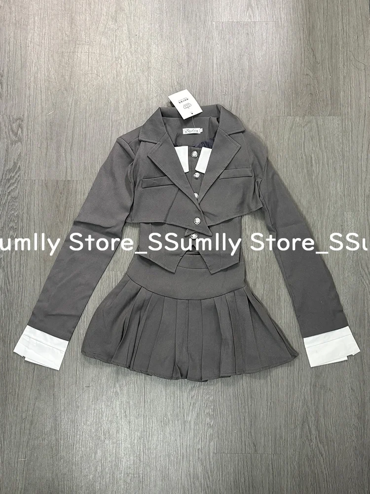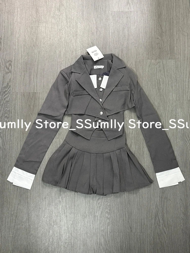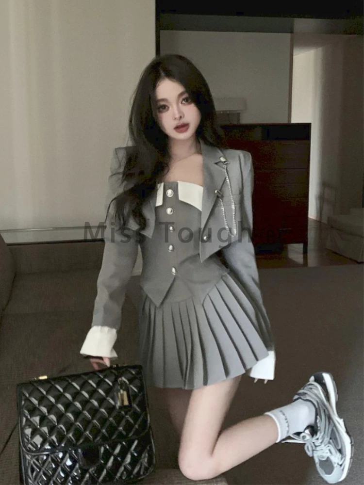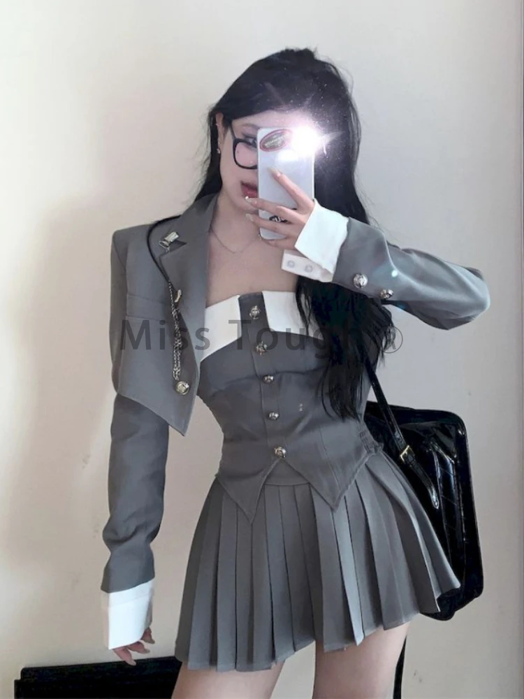 Preppy Style Elegant 3 Piece Set Women Fashion Casual Blazer Suit Female Pleated Mini Skirt + Irregular Camisole + Short Jacket