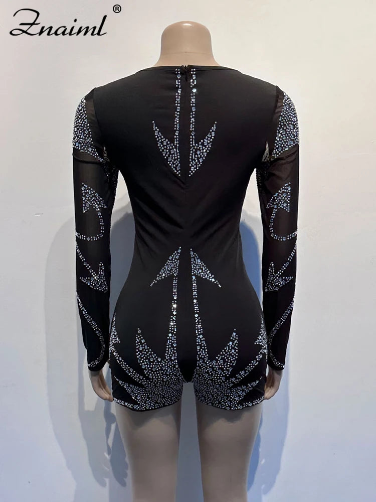 Znaiml Elegant Long Sleeve Playsuit Nightclub Rompers Birthday Outfits Woman Sparkly Diamonds Rhinestone Short Jumpsuits Luxury